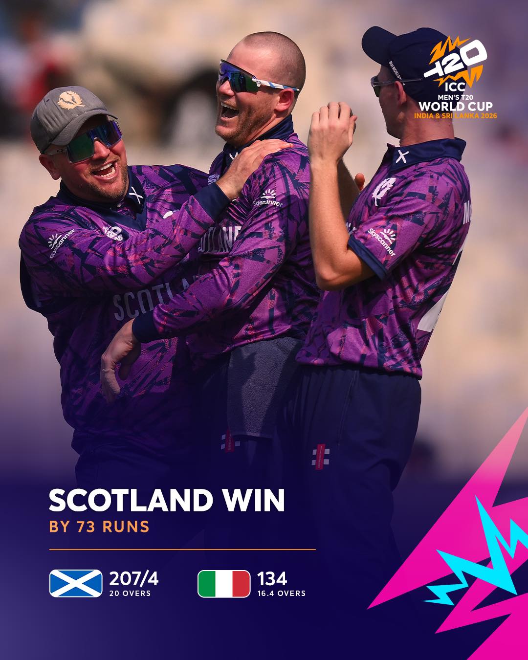 COLOMBO (News 1st); Scotland powered to their first win of the ICC Men’s T20 World Cup 2026 with a dominant 73‑run victory over debutants Italy at Eden Gardens.