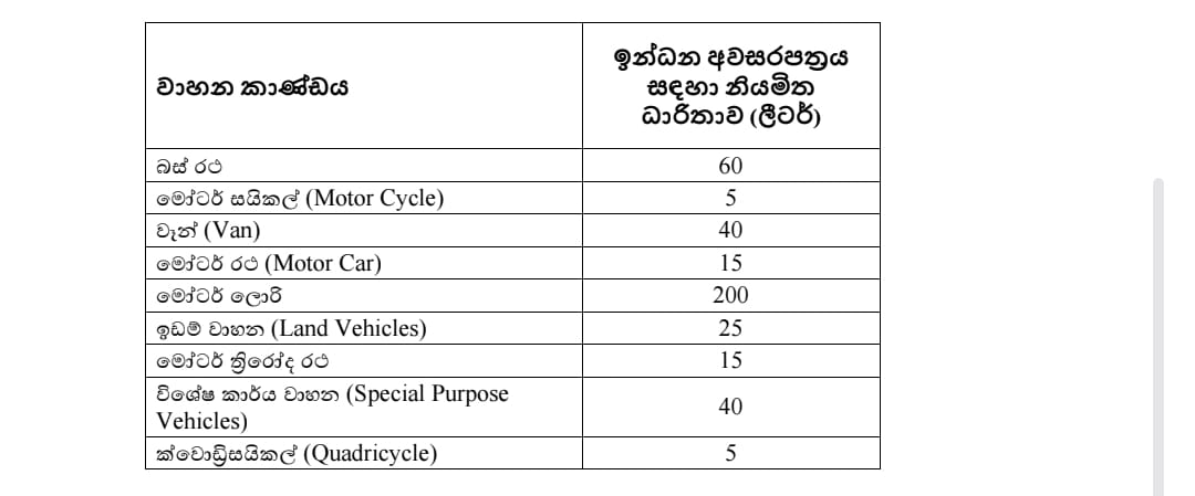 Motorcycles will be entitled to 5 litres, motor cars and three-wheelers 15 litres, vans 40 litres, buses 60 litres, and motor lorries up to 200 litres per week. Special-purpose vehicles will receive 40 litres, while quadricycles will be allocated 5 litres.