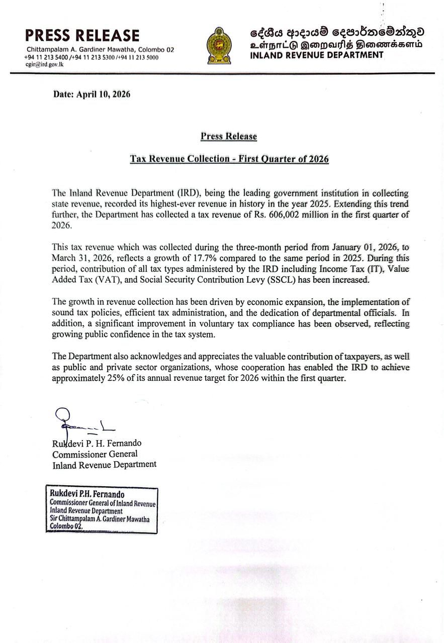 COLOMBO (News 1st); Sri Lanka’s Inland Revenue Department (IRD) has recorded a strong start to 2026, collecting Rs. 606,002 million in tax revenue during the first quarter of the year, according to an official press release issued on April 10, 2026.
